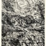 The book and the prints investigate the idea of a lacuna, a gap in a manuscript, a missing portion of a story. In the linocuts I have built layers of finely carved abstract text to create background tone. The spaces between the text become a shadow of the tree as it falls, more prominent in the brighter life-giving colours used in the book. The rebuilt tree is gradually mended so it can re-emerge in the book. Each panel of the falling tree is first shown as a separated reflected colour, and then white tree sections are gently stitched together to gradually reveal the standing tree. In my work, I have often referred to the themes of fragility, and the desire to mend and repair, and the paper itself is important to this, as well as the stitching. The paper has been made in Japan for hundreds of years, primarily for the use of repair, but its translucency and ethereal fabric-like texture continue to fascinate and inspire me. It also has a beautiful crispness when layered with water-based relief inks that are heavily laden with extender. That is why I like making books like this, and showing them in a gallery where visitors can look through them in a quiet, contemplative space. They can turn each crisp, crumpled page; see the same image and its layers from the front and the back. And in this case, see the repair of the lacuna, the gap in the story of the tree that looked like a pleading hand at the lake’s edge.